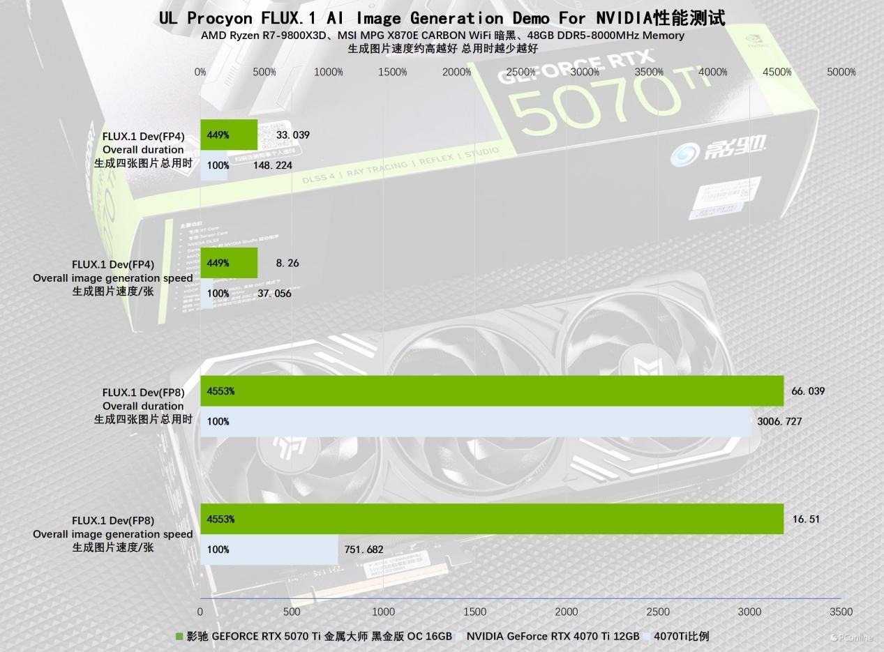 利用UL Procyon测试版本FLUX.1 AI Image Generation Demo For NVIDIA,我们可以先取FP8精度模型与FP4精度模型分别进行测试。在均使用FP8精度模型时,影驰RTX 5070 Ti 金属大师OC 16GB能够做到16.51 s生成一张图,而RTX 4070 Ti明显已经爆显存了,运行时已经需要依赖共享内存才能运行,因此耗时超长;而切换到FP4精度模型后,影驰RTX 5070 Ti 金属大师OC 16GB生成图片的速度能够提升到8.26秒一张,效率同样是翻了几番。这一切的AI性能提升,不仅是Blackwell架构能够实现原生对FP4精度模型的支持,从而带来的性能优势;更是影驰RTX 5070 Ti 金属大师OC 16GB所配备的16GB GDDR7显存带来了更大容量与更高带宽的传输优势。