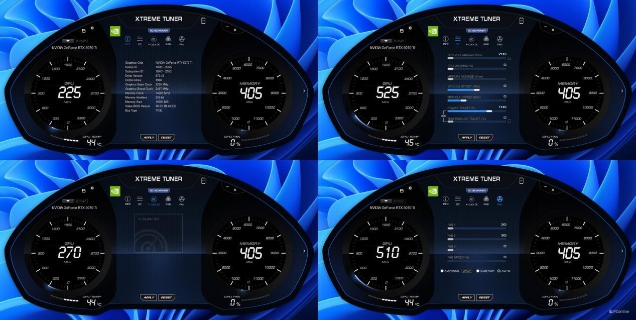 影驰最新版本的魔盘XtremeTuner软件就可以支持GEFORCE RTX 50系列显卡,已经能够正确识别出影驰RTX 5070 Ti 金属大师OC 16GB显卡,同样还能对显卡进行实时侦测、超频、一键超频、RGB彩灯调节(金属大师系列不可用),以及显卡风扇转速调节等。