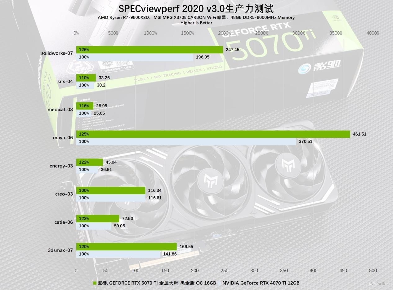 再看看工业领域的表现,SPEC2020能够反映显卡的工业能力,在多项测试中影驰RTX 5070 Ti 金属大师OC 16GB依旧足够的猛,对比RTX 4070 Ti平均有16%的提升。
