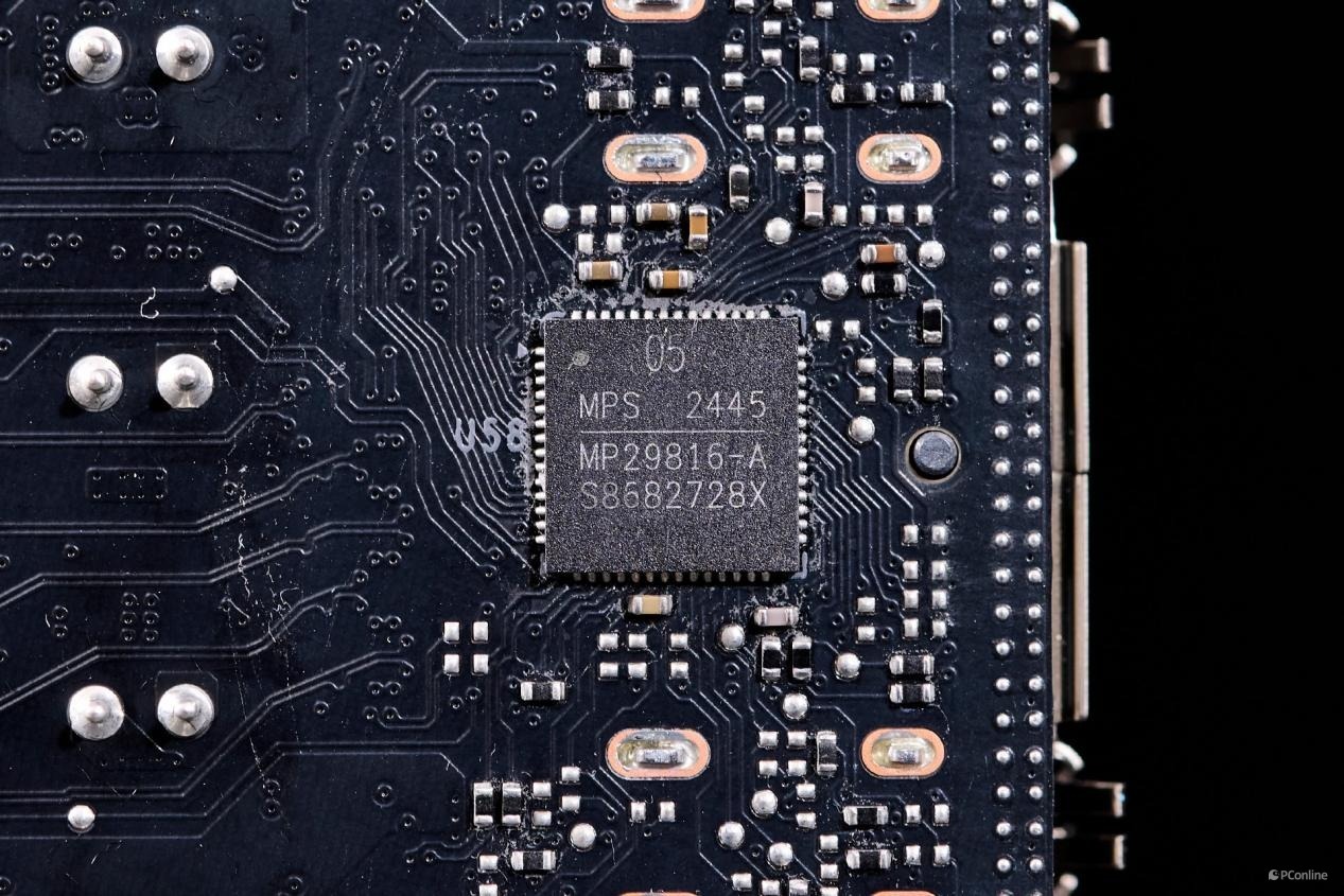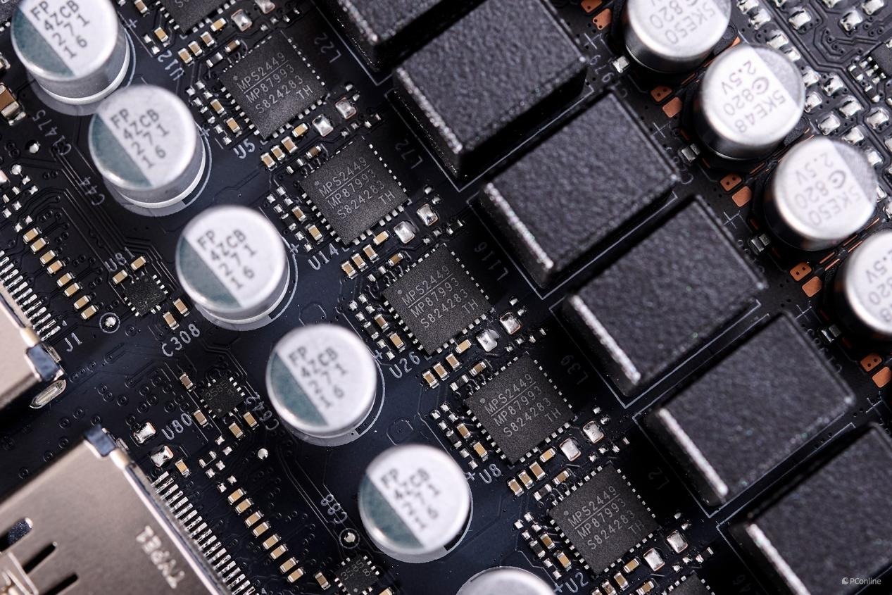 每相供电电路均配上了固态电容、全封闭电感,以及DrMos芯片的配置,其中DrMos来自MPS 的MP87993芯片,单颗最大持续电流可高达90A。