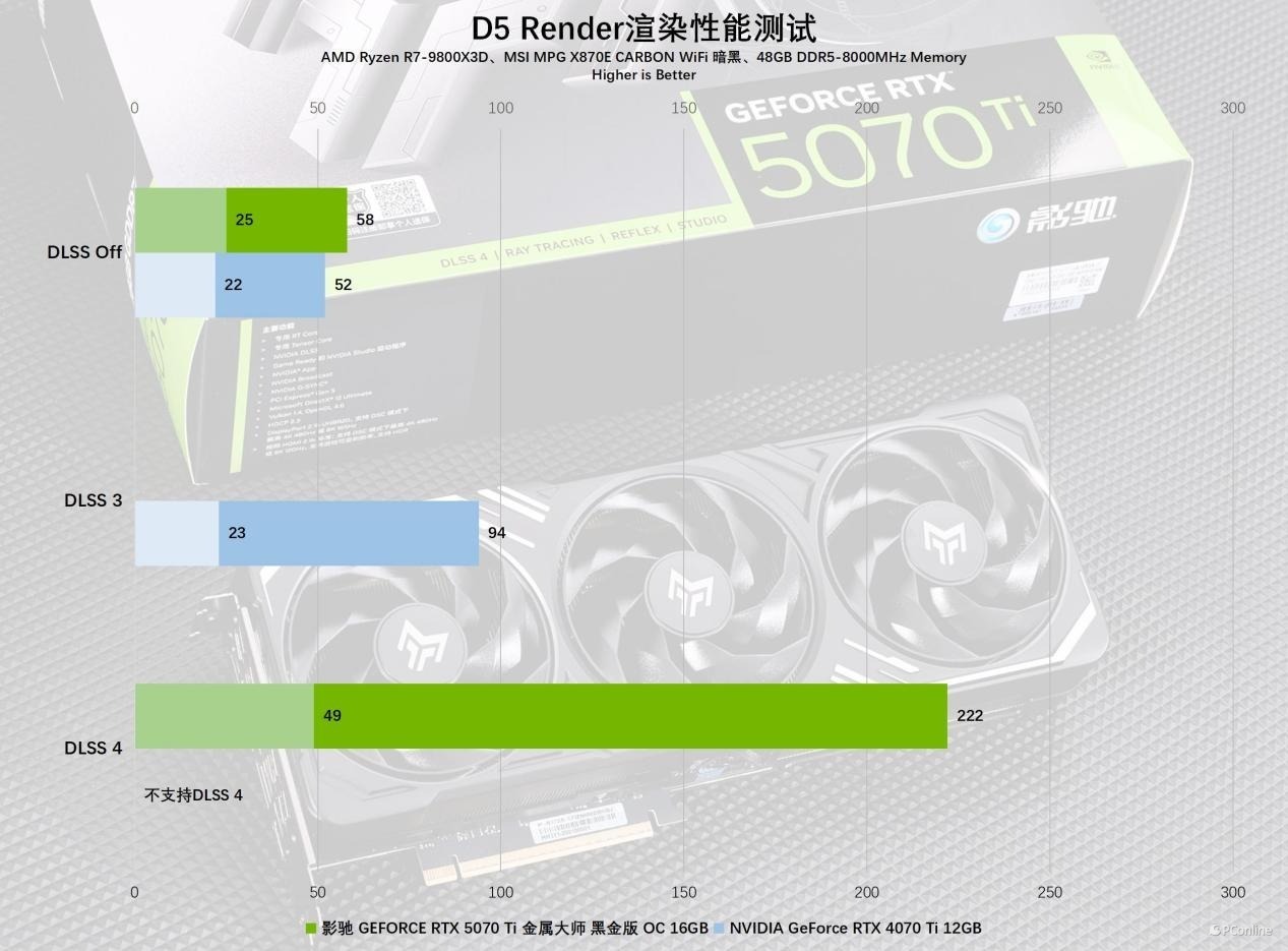 实测影驰RTX 5070 Ti 金属大师OC 16GB在开启DLSS 4以后,整个渲染预览的界面变得丝滑流畅,帧数基本在222 FPS附近,而对比不开DLSS时,仅58 FPS的表现来看,性能几乎是提升了4倍以上。即便是面对RTX 40系的DLSS 3,也一点不虚,性能优势也有50%以上。