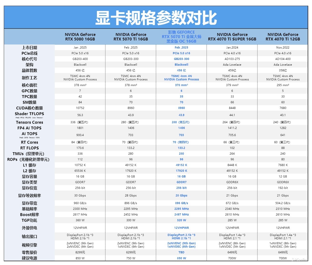 从规格参数来看,GEFORCE RTX 5070 Ti配备了6个GPC、35个TPC、70个SM单元、280个TMUs纹理单元、96个ROPs光栅化处理单元,以及8960个CUDA核心。与上一代的GEFORCE RTX 4070 Ti相比,GEFORCE RTX 5070 Ti在性能规格上更胜一筹,其大部分参数甚至超过了GEFORCE RTX 4070 Ti SUPER显卡。