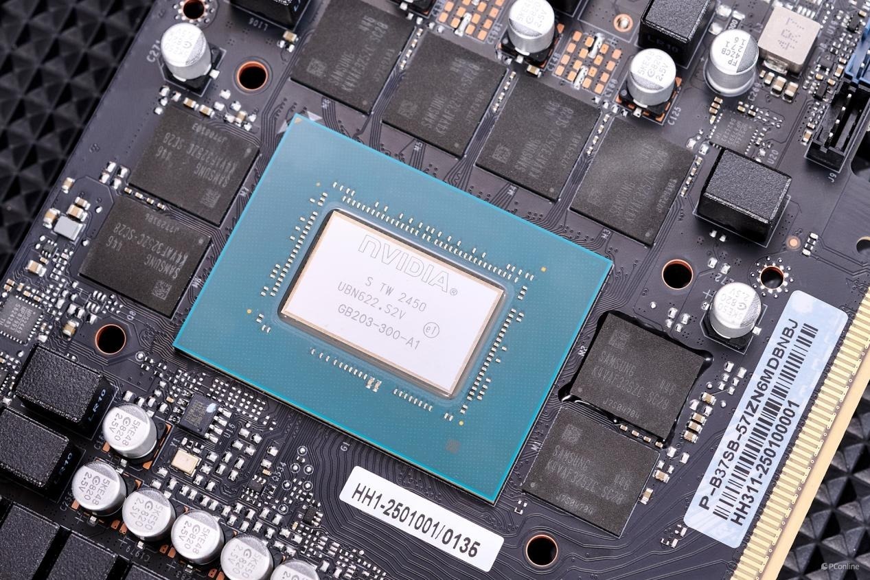 RTX 5070 Ti核心代号:GB203-300-A1,生产周期为24年50周;而核心颗粒上下右三侧分别是8颗三星GDDR7显存颗粒,其中位于最下的1颗显存颗粒还进行了打胶加固处理。