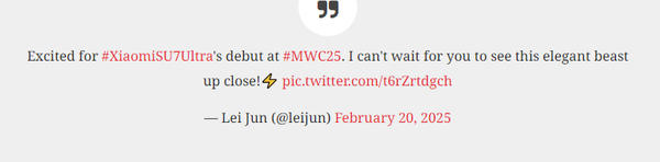 【CNMO科技消息】小米SU7 Ultra已在国内开启预售,本月底将正式发布,虽然确切日期尚未公布,但雷军已通过X平台宣布了这款车型的全球首发计划。2月20日,雷军在推特上透露:“小米SU7 Ultra将在MWC25上首次亮相。我迫不及待地想让大家近距离目睹这辆优雅的‘野兽’。”