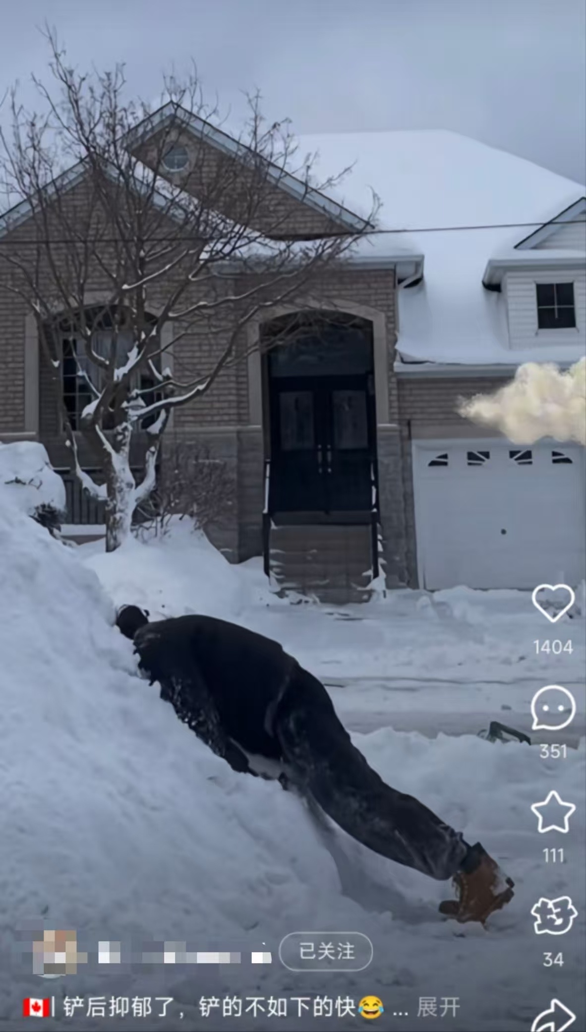 暴雪除了给当地交通带来不便,还引发了“铲雪潮”。许多当地华人在社交平台上分享铲雪经历,更有人问价“铲雪”。有网友调侃自己患上“铲后抑郁”,雪铲得不如下得快。