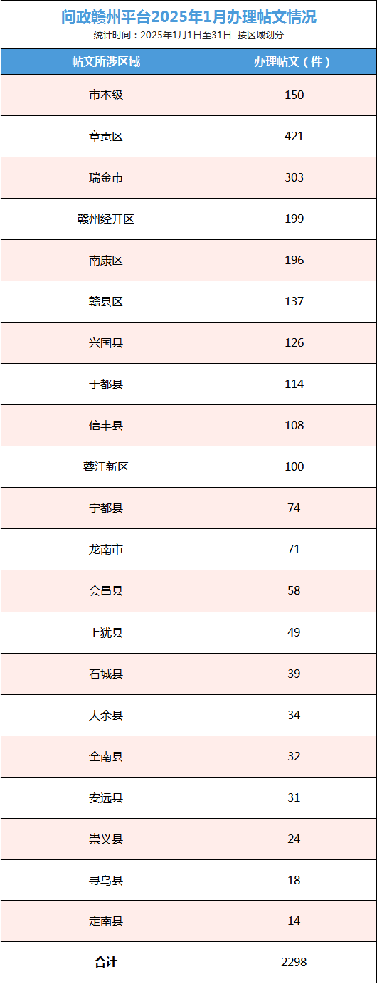 “问政赣州”网络问政平台自2019年7月10日运行以来,截至2025年1月31日,转办网友投诉咨询帖文145800件,办理回复145692件,办理回复率99.92%。
