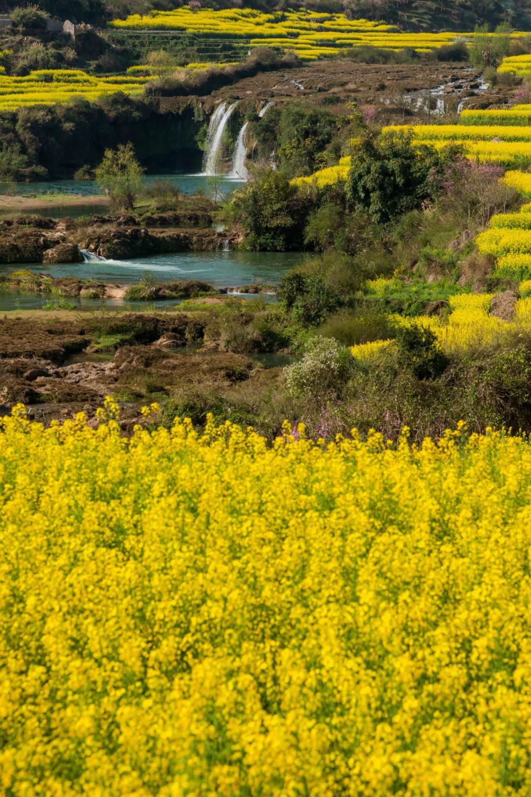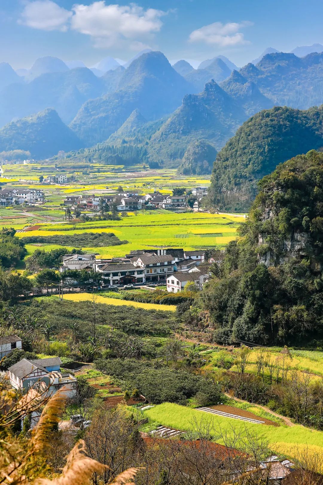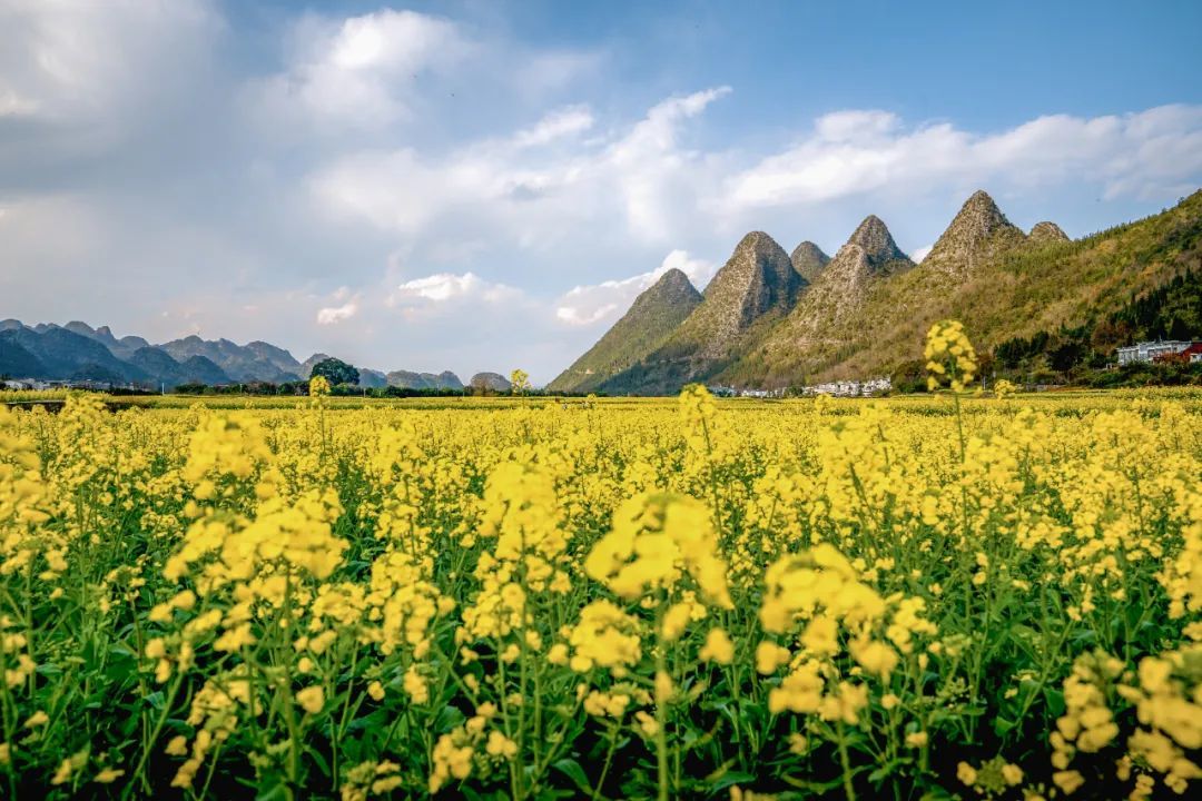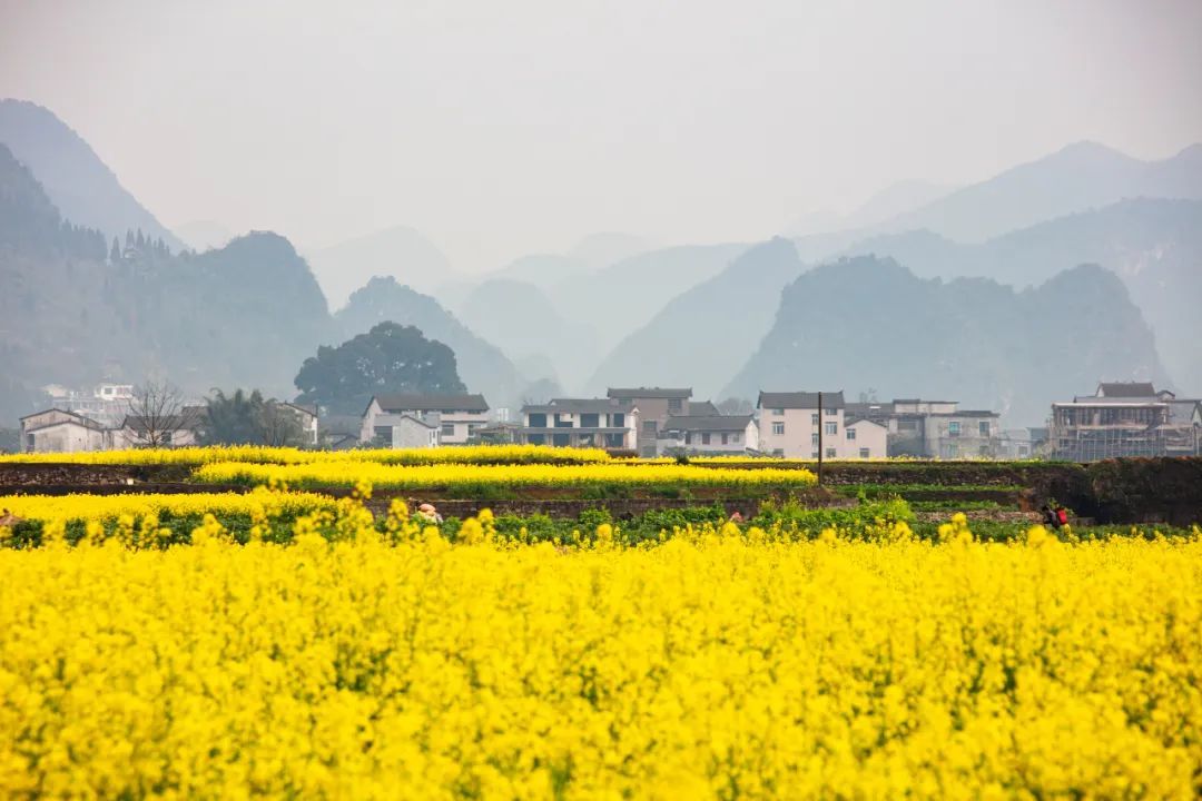 喀斯特峰林间,金黄的花海绵延至天际,金鸡峰丛的孤峰与螺丝田的螺旋梯田是两大经典视角。清晨薄雾中,花田与村庄若隐若现,宛如仙境。