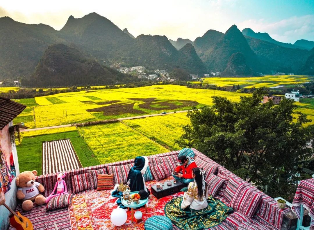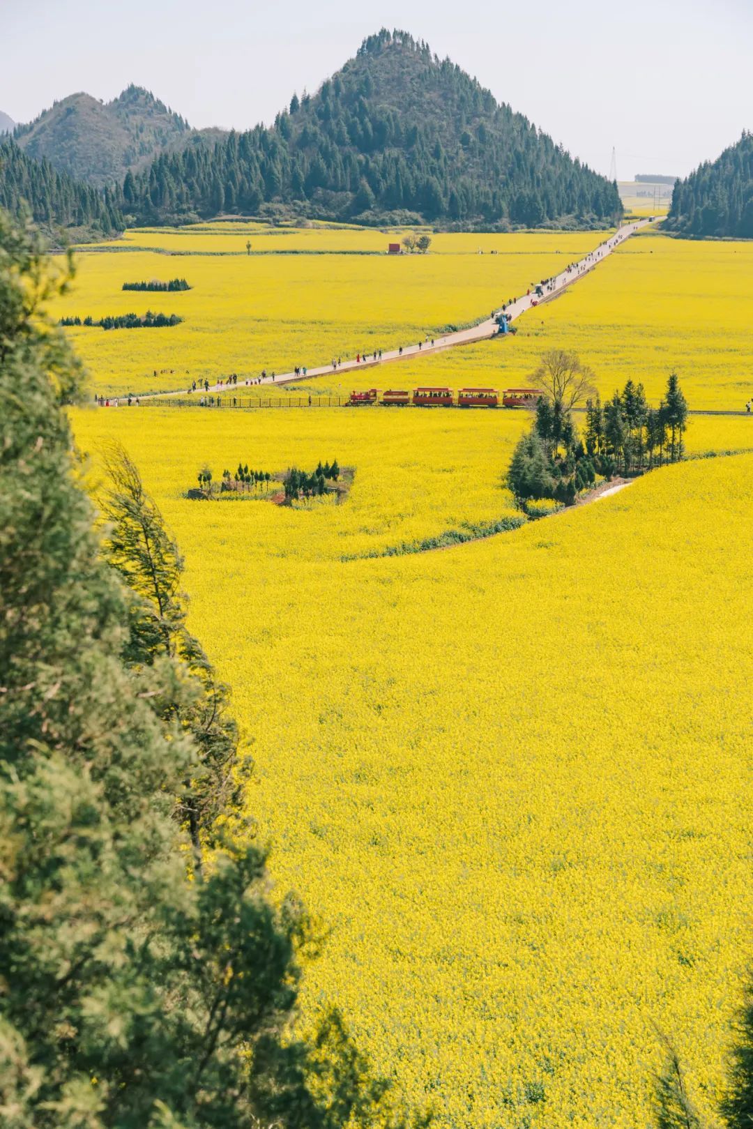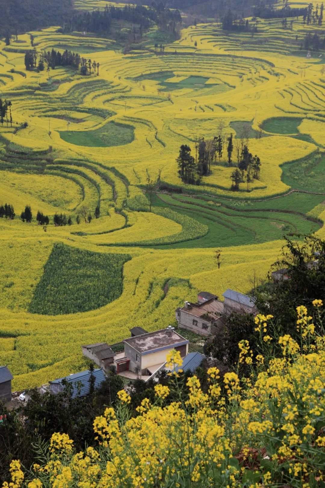 喀斯特峰林间,金黄的花海绵延至天际,金鸡峰丛的孤峰与螺丝田的螺旋梯田是两大经典视角。清晨薄雾中,花田与村庄若隐若现,宛如仙境。
