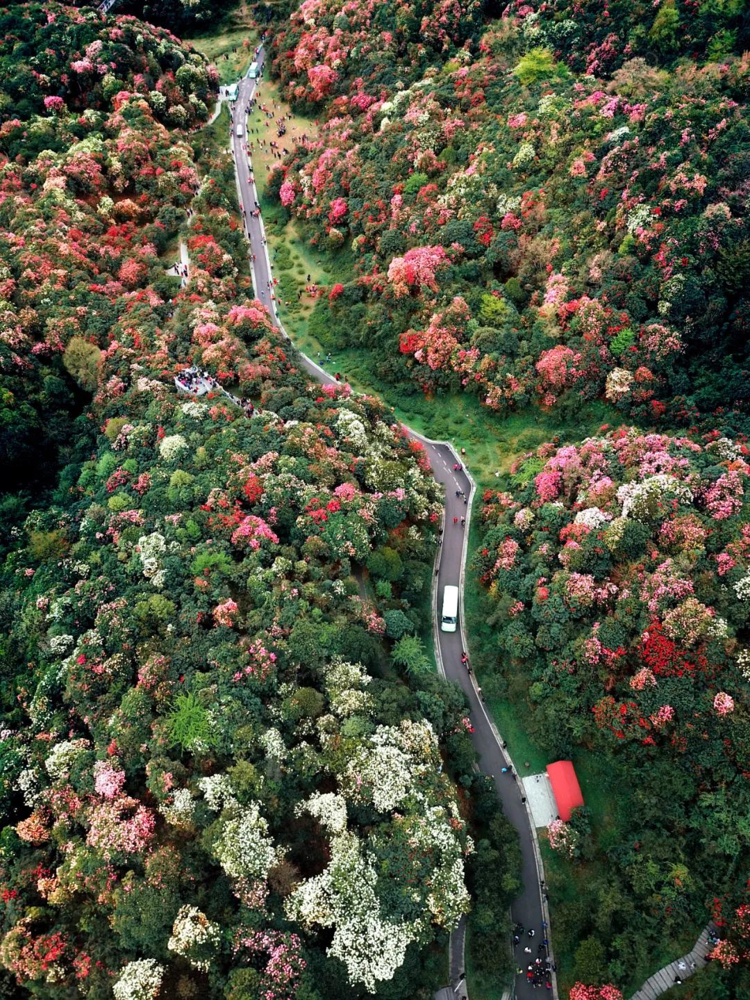 毕节市的百里杜鹃景区,深藏于乌蒙山腹地,延展成一条长达50多公里、宽度介于1至3公里的壮丽野生杜鹃林带。这里汇聚了41种杜鹃品种,绽放出10种迷人花色,共同织就了一幅绚烂多彩的“地球彩带”。