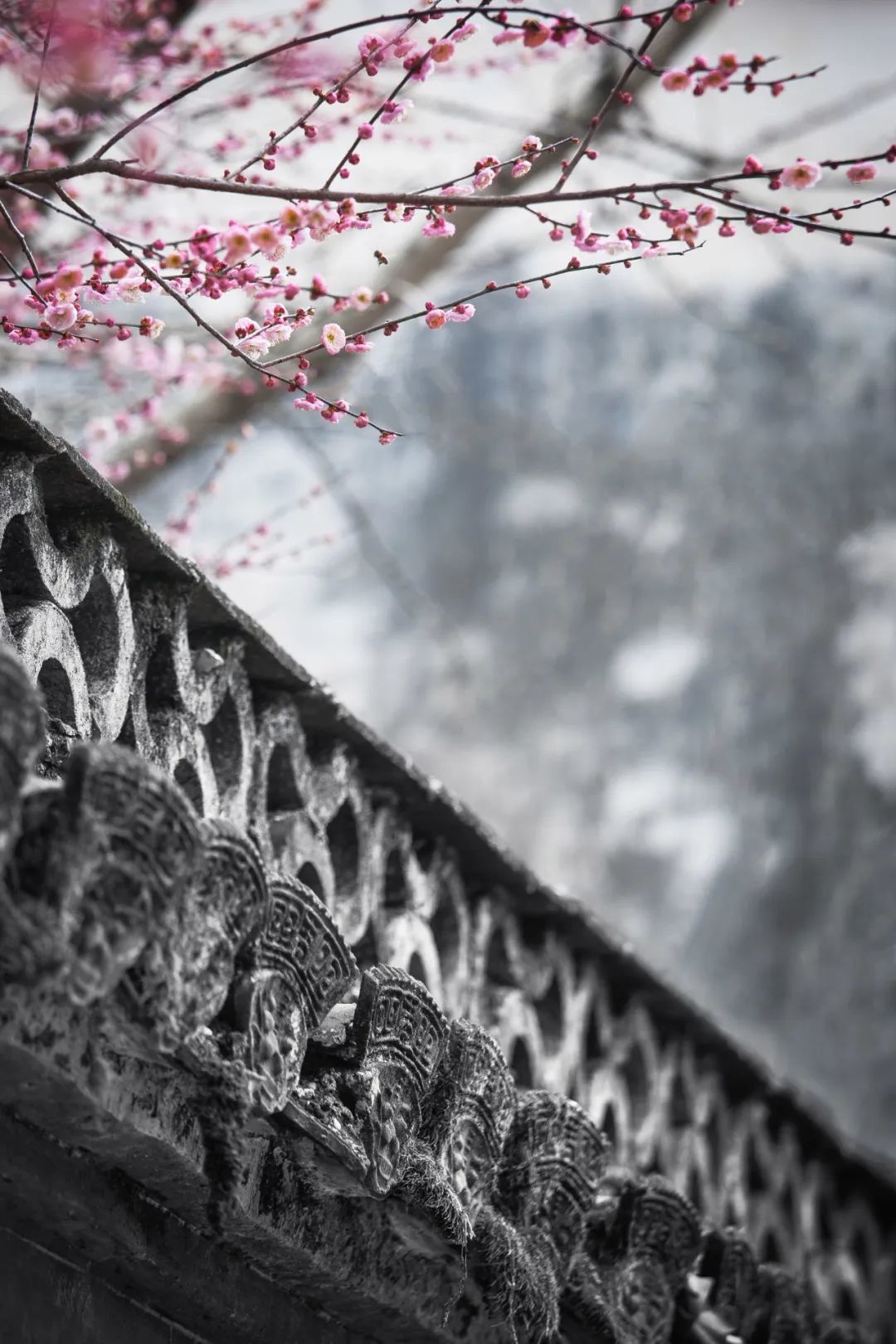 走进卖花渔村,就仿佛迈入了一个浓缩版的国画徽州。寂静古朴的徽派古村坐落在群山怀抱中,深浅不一的粉白梅花盛开,远远望去,整个山谷云雾朦胧,红梅似海。在山道上漫步,不出几分钟,便能沾染一身的梅花香。