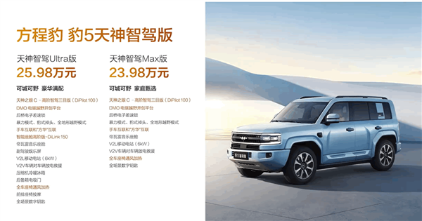其中,搭载天神之眼智驾系统的豹5,Max版售价23.98万元,Ultra版售价25.98万元。Ultra版比Max多出智能座舱高阶版-DiLink 150、副驾娱乐屏、压缩机冷暖冰箱、后备厢电吸门、前排座椅按摩等智能舒适配置。