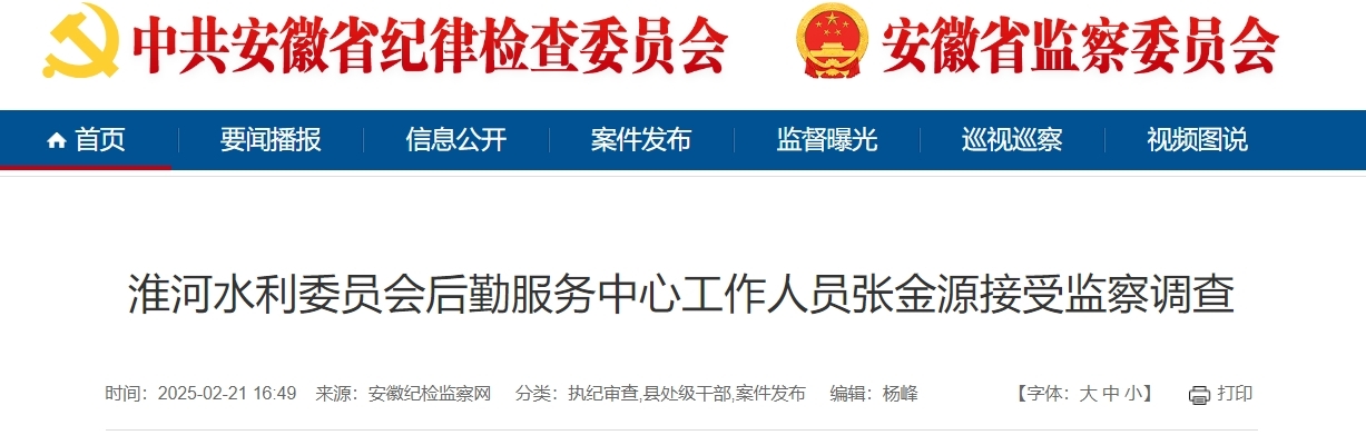 淮河水利委员会后勤服务中心工作人员张金源涉嫌严重违法,经安徽省监委指定管辖,目前正接受蚌埠市淮上区监委监察调查。(蚌埠市纪委监委)