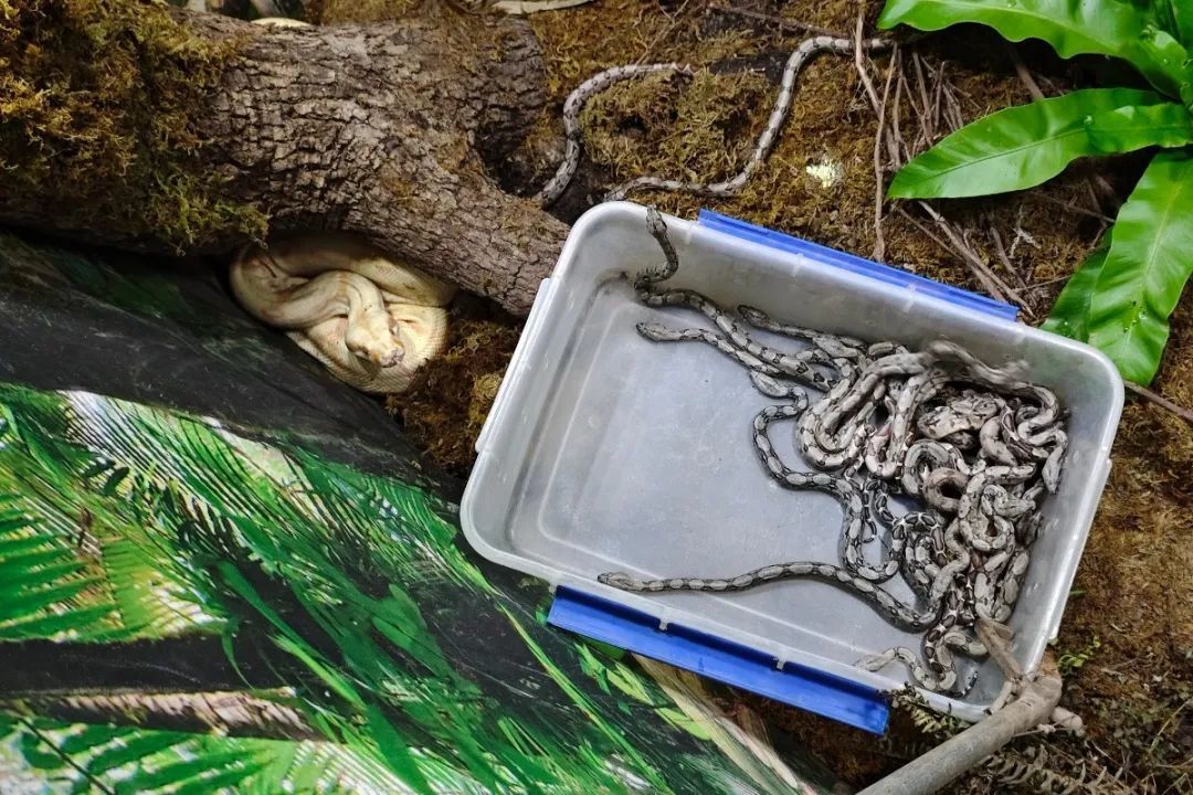 据介绍,红尾蚺属于胎生的蛇类,受精卵在母蛇体内发育、孵化,孕育成熟后直接生出一条条小蛇。它们聚集在母蛇周围,好奇探索周围的环境。胎生动物的胚胎受到母蛇的适当保护,孵化存活率比卵生者较有保障。接下来的生长发育,就由饲养员来接手保护。因为展区空间有限、容易造成众多小蛇的不良竞争,于是饲养员对新出生的小蛇进行清点,随后取出单独饲养,便于观察成长情况。