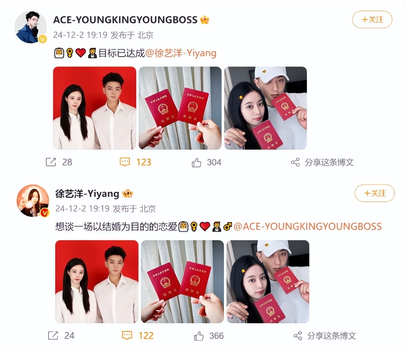 徐艺洋也在个人社交账号发文称:“想谈一场以结婚为目的的恋爱。”
