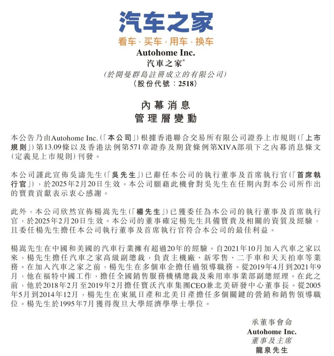 昨日,汽车之家还发布一则管理层人事变动。公告显示,吴涛已辞任公司的执行董事及首席执行官,于2025年2月20日生效;杨嵩已获委任为公司的执行董事及首席执行官,于2025年2月20日生效。