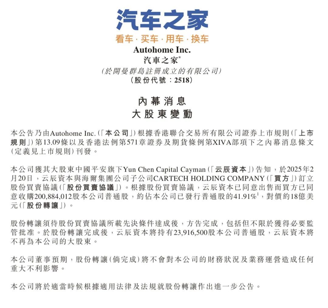 2月20日,汽车之家在港股发布公告称,海尔集团公司(下称“海尔集团”)旗下二手车业务公司Cartech Holding Company(下称“卡泰驰控股”)与中国平安旗下Yun Chen Capital Cayman(下称“云辰资本”)达成协议,卡泰驰控股将以总价约18亿美金收购云辰资本持有的汽车之家已发行普通股股份。不过,本交易受成交条件约束,仍需获得监管部门的批准并满足相关交割条件。