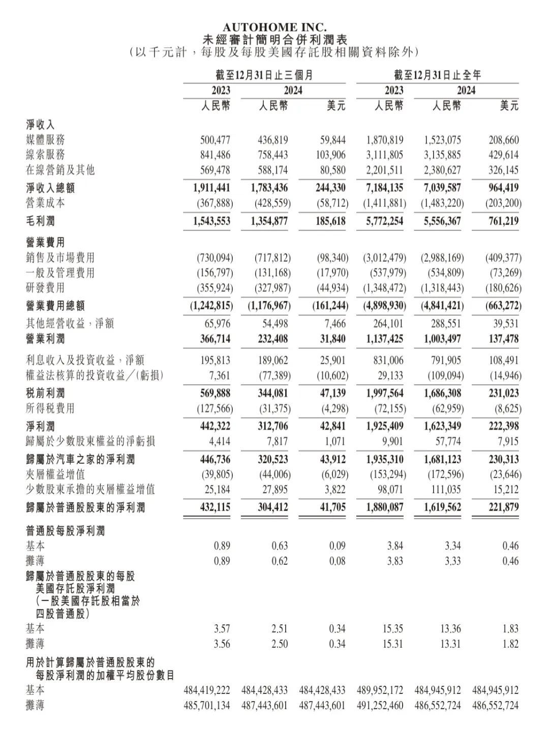 2月20日,汽车之家发布2024年业绩公告。财报显示,2024年全年报告期内,汽车之家营收为70.40亿元,相比于2023年的71.84亿元同比下滑2.01%;归属母公司净利润为16.20亿元,相比于2023年的18.80亿元同比下滑13.86%。业内人士认为,随着新能源品牌将门店开至商圈以及包括抖音、快手等短视频的盛行,车企在汽车垂直平台的投入开始变少,同时,面临包括懂车帝、易车网在内的同行竞争,汽车之家的市场份额被挤压,导致其活得不如从前滋润。