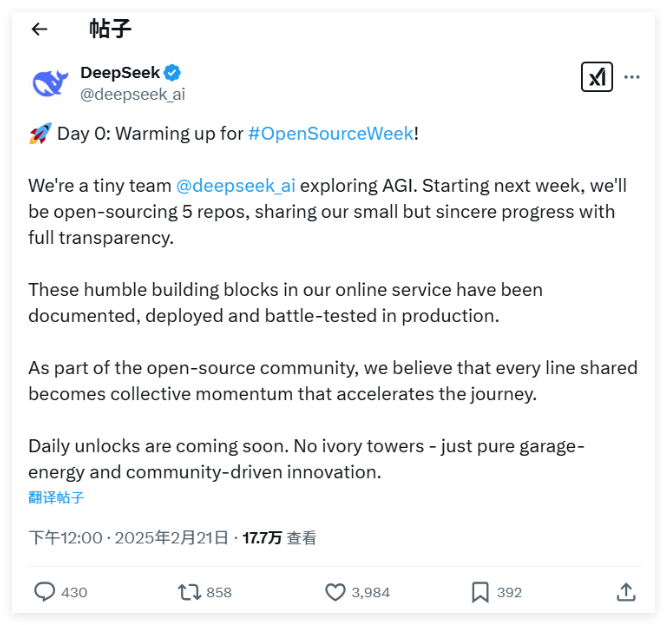 1、超给力!DeepSeek 宣布下周开源五个项目