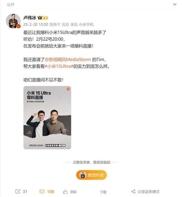 站长之家2月20日 消息:近日,小米集团卢伟冰在社交媒体上宣布,他将于2月22日举办一场小米15Ultra爆料直播,并特别邀请了影视飓风Tim一同参与,旨在向广大消费者展示小米15Ultra的强大实力。