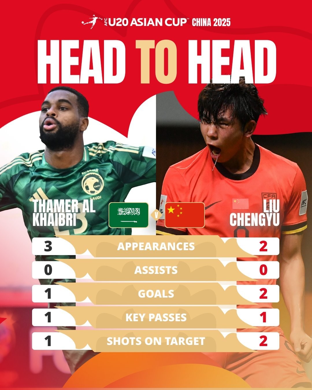 北京时间2月22日,U20亚洲杯淘汰赛中国vs沙特阿拉伯赛前,亚足联官方发布了一张两队前锋数据对比的图片。