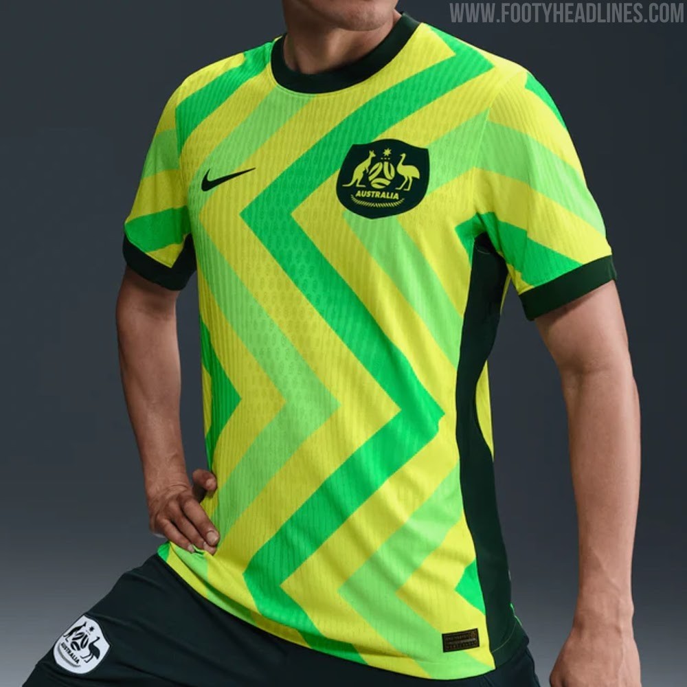 主场球衣设计:主场球衣采用大胆、动感的图案,由澳大利亚标志性运动颜色(黄色和翠绿色)交叉的对角条纹组成,并首次在衣领内侧加入原住民旗帜。