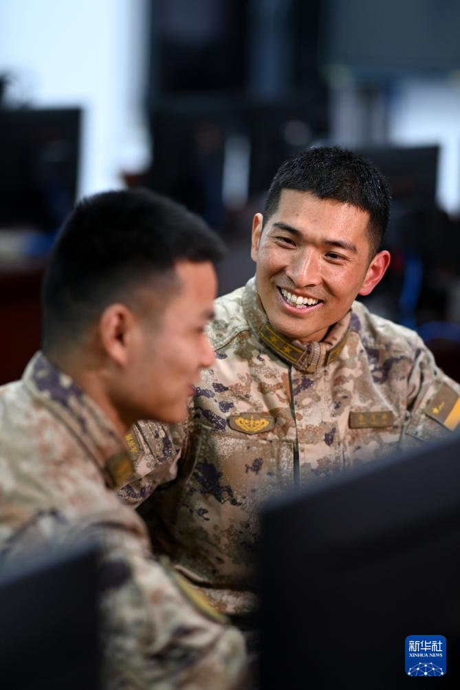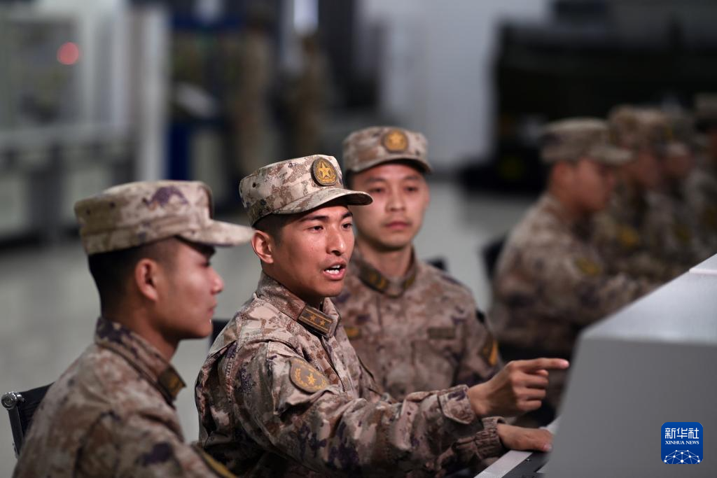 火箭军某旅发射营教导员张平坤(左二)与号手交流装备操作技能技巧(资料照片)。
