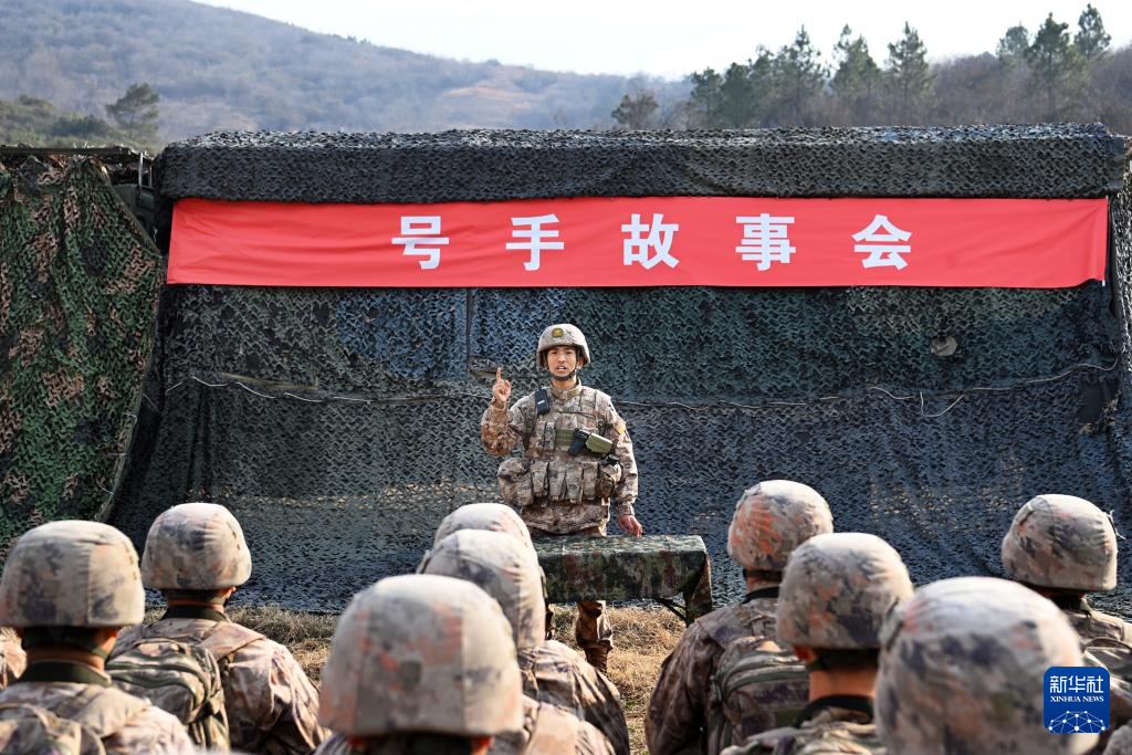 火箭军某旅发射营教导员张平坤(右)与营连骨干深入交流,传授带兵育人经验方法(资料照片)。