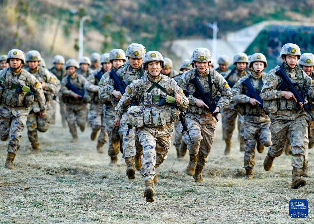 火箭军某旅发射营教导员张平坤(中)在五公里越野中带领官兵冲锋(资料照片)。