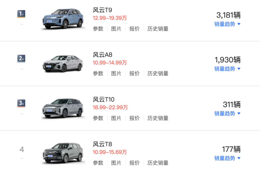 奇瑞全新新能源序列“风云”于2023年11月9日正式发布,目前已经覆盖轿车以及SUV车型,包含风云A8(插电式紧凑型轿车,售价区间10.99万-14.99万元)、风云T6(插电式紧凑型SUV,售价区间12.99万-15.69万元)、风云T9(插电式中型SUV,售价区间12.99万-16.99万元)、风云T10(插电式中大型SUV,售价区间18.99万-22.99万元)、风云A8L(插电式紧凑型轿车,售价区间11.99万-14.99万元)、风云T8(插电式紧凑型SUV,售价区间10.99万-15.69万元)。