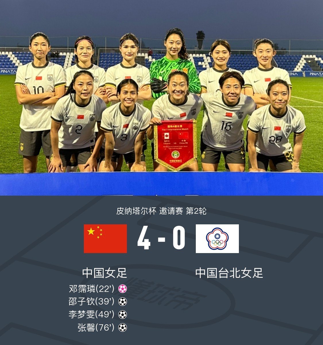 北京时间2月22日皮纳塔尔杯 邀请赛 第2轮,中国女足对阵中国台北女足。上半场中国台北队邓霈璘打入乌龙球,邵子钦破门,下半场李梦雯建功,张馨锁定胜局。最终比分中国女足 4-0 中国台北女足。