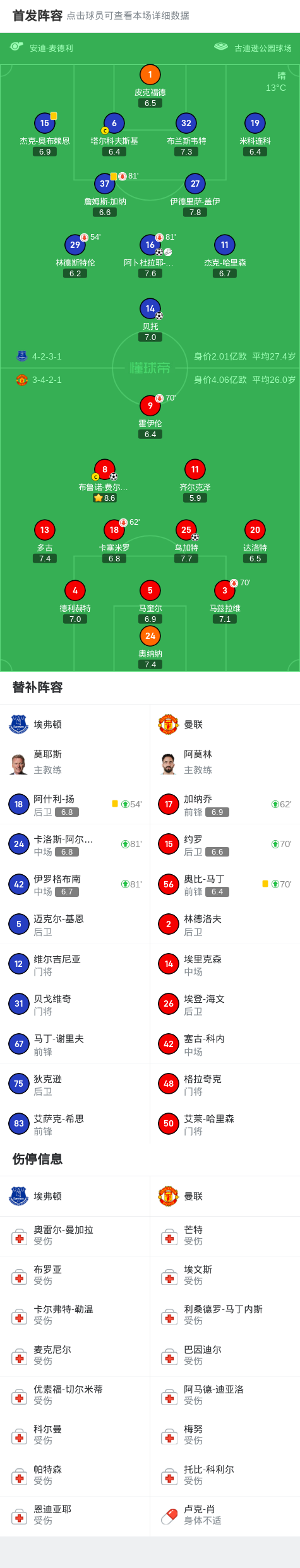 第19分钟,贝托反越位破门成功,曼联客场0-1落后埃弗顿!