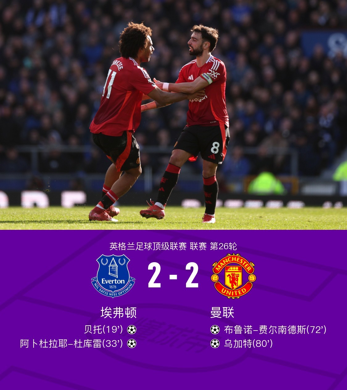 北京时间2月22日英格兰足球顶级联赛 联赛 第26轮,埃弗顿主场对阵曼联。埃弗顿贝托破门,阿卜杜拉耶-杜库雷破门。曼联布鲁诺-费尔南德斯破门,乌加特破门。最终比分埃弗顿 2-2 曼联。
