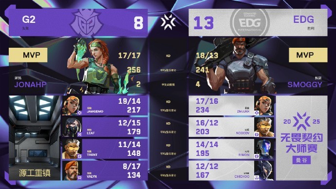 EDG上半场进攻开局,Smoggy开场就祭出鬼魅一打三残局!此后EDG收下对手存钱局,2-0领先(以下比分均EDG在前)。