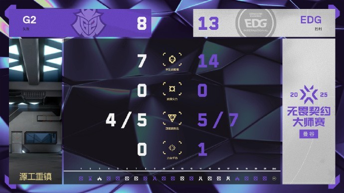 第25回合,EDG进攻在A大的对拼中陷入劣势,G2打出完胜,12-13。