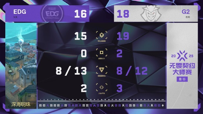 第14回合,EDG提速A厅,G2顶住压力,球球遗憾错失1v3残局,12-2。第15回合,EDG存钱局丢分,12-3。