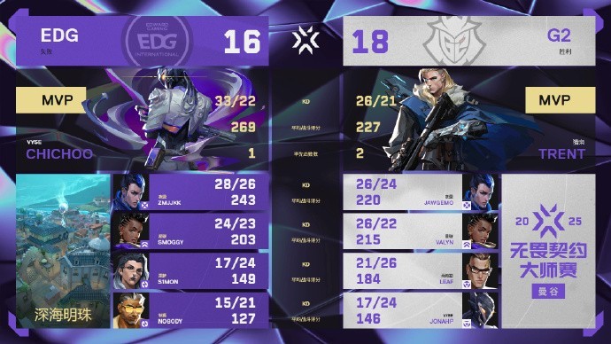 北京时间2月22日,无畏契约曼谷大师赛瑞士轮继续进行,CN赛区头号种子EDG 2-1力克美洲赛区头号种子G2,以两连胜的姿态挺进四强!