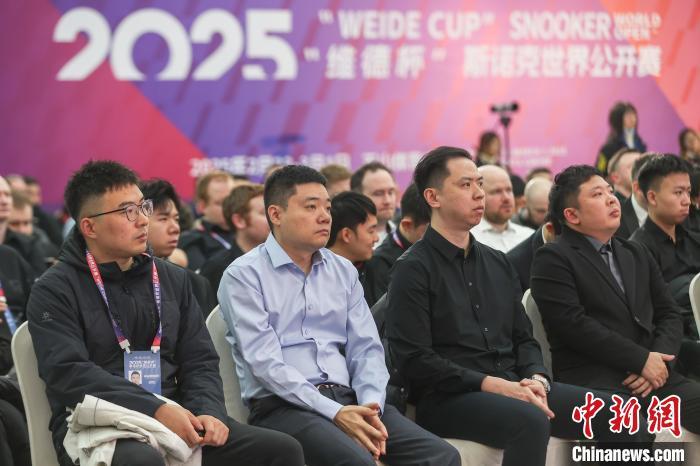 图为中国知名斯诺克运动员丁俊晖(图左二)出席2025“维德杯”斯诺克世界公开赛开幕式。中新社记者 刘力鑫 摄