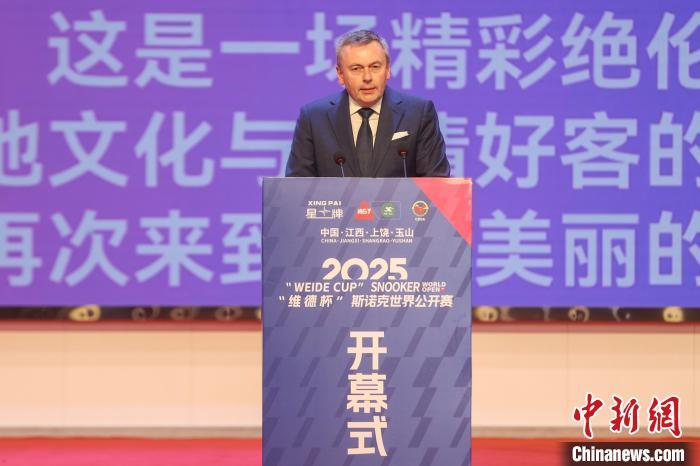 图为2025“维德杯”斯诺克世界公开赛开幕式上,世界职业比利和斯诺克协会主席杰森·弗格森发表致辞。中新社记者 刘力鑫 摄