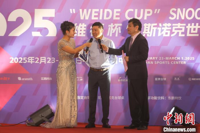 图为2025“维德杯”斯诺克世界公开赛开幕式的走红毯环节,中国知名斯诺克运动员丁俊晖(图中)在接受主持人采访。中新社记者 刘力鑫 摄