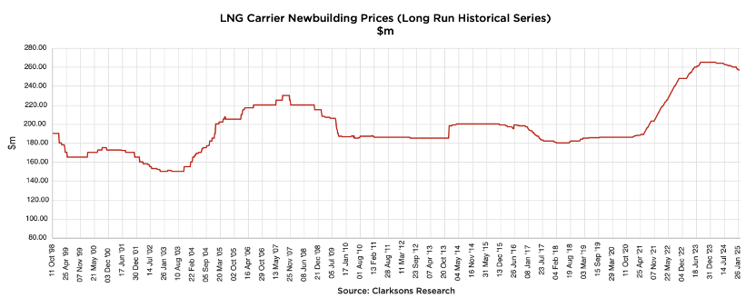 从目前新造船市场来看,克拉克森数据显示,截至2月21日,LNG运输船新造船价格为2.57亿美元,仍处于高位水平。