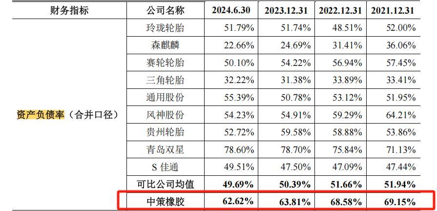 此外,尽管中策橡胶在业绩表现上优于行业平均水平,但资产负债率却远高于行业平均水平,2021年—2023年及2024年上半年,中策橡胶资产负债率(合并口径)分别为69.15%、68.58%、63.81%和62.62%,主要负债为应付账款及各类银行借款。同期,行业可比公司均值分别为51.94%、51.66%、50.39%、49.69%。