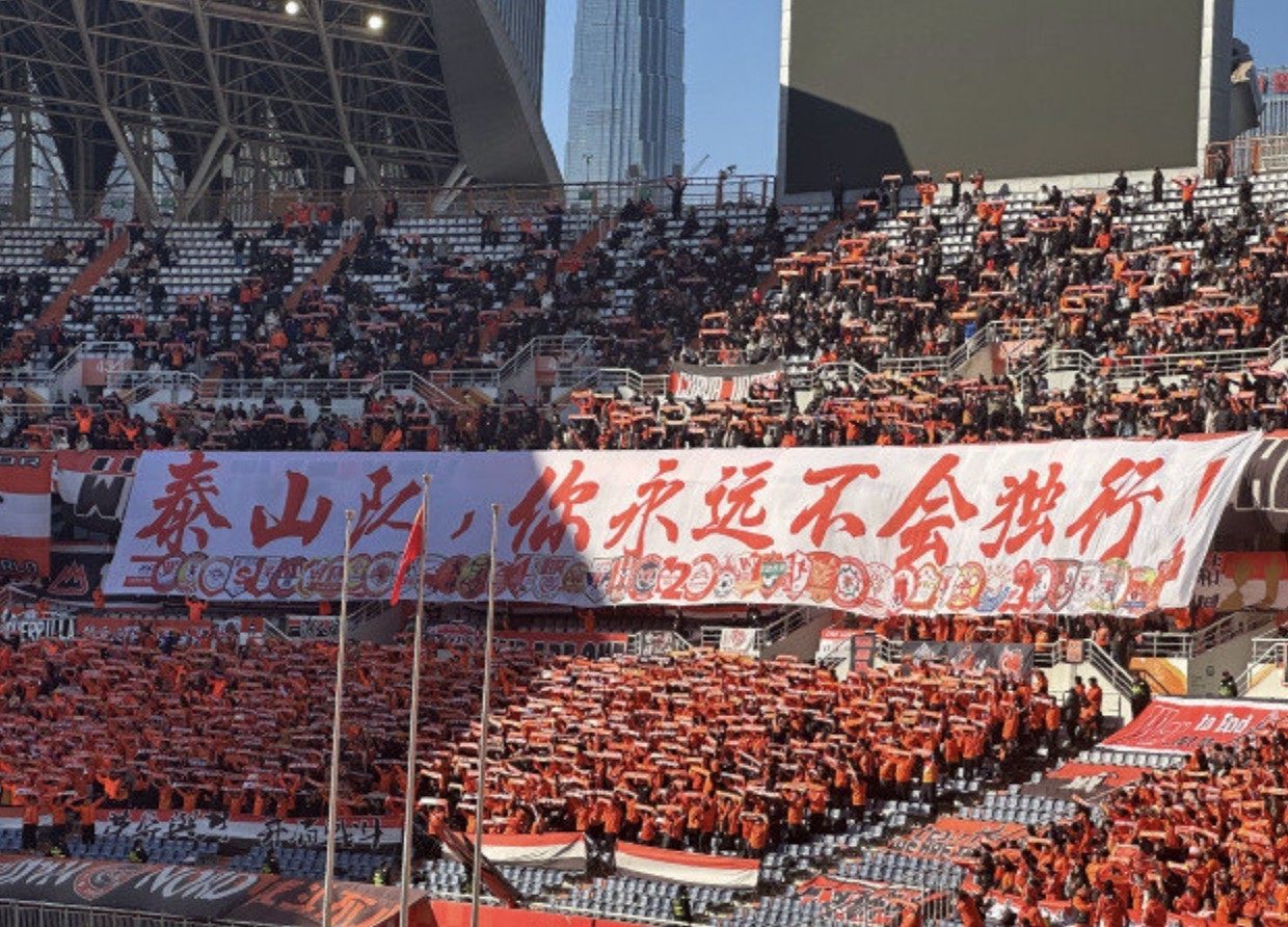 2月23日山东泰山队迎来新赛季首战,他们在主场对阵河南队。《济南时报》表示,不少球迷现场观战,几乎座无虚席,球迷们还在看台挂出一幅巨幅TIFO很是亮眼,上面写道:“泰山队,你永远不会独行。”