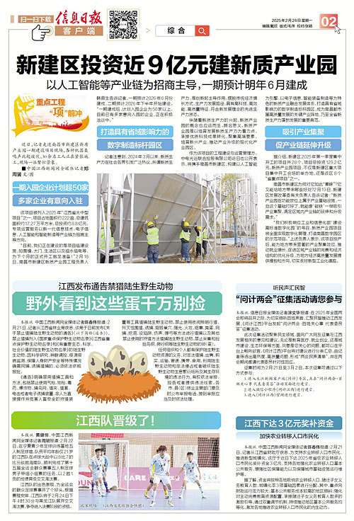 “我们积极响应工业和信息化部‘建设高标准数字化园’的号召,新质产业园项目将全面实现数字化管理,打造南昌数字园区的示范项目。”上述负责人表示,该项目投产后,能为地方带来显著的产业聚集效应,推动就业增长,促进区域产业链的完善和经济结构的优化升级,为地方经济高质量发展提供模板和方向,切实走好新型工业化道路。