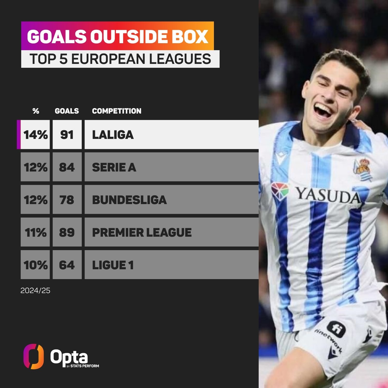 本赛季至今,西甲联赛已经产生了91个来自禁区外的进球,在总共的649个进球当中占比为14.02%,这两项数据在五大联赛里均为最高。
