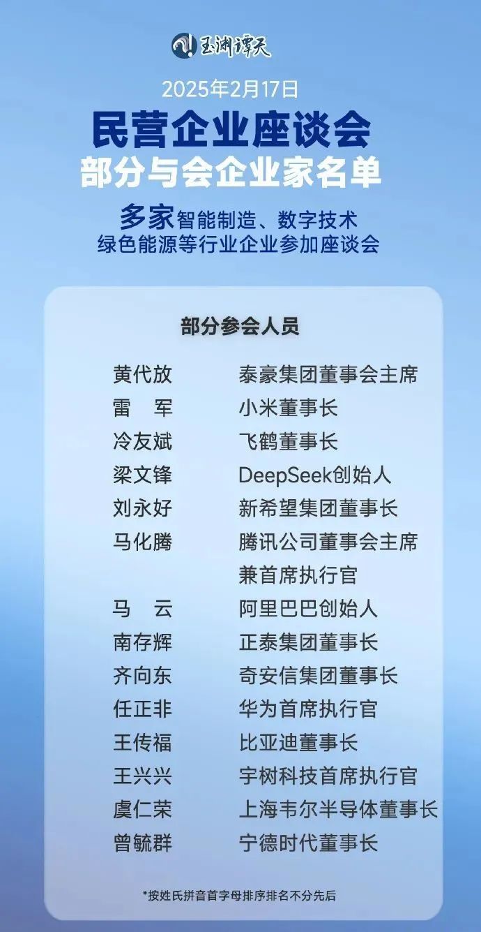从央视《新闻联播》17日晚播出的画面中可以看到, 来自 江西南昌的企业家、 泰豪集团董事会主席黄代放与腾讯公司董事会主席兼首席执行官马化腾相邻而坐,与其同排而坐的还有小米董事长雷军、DeepSeek创始人梁文锋等。 而与江西昌兴航空装备股份有限公司董事长江滨相邻而坐的则是美团创始人兼首席执行官王兴。