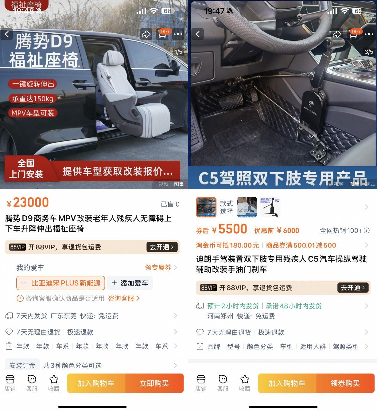 其中改装成残障专用并价格不便宜,以腾势D9改装福祉座椅为例,基本上最低也得要23000左右,而如果在改装手油门刹车,还得再加5500。