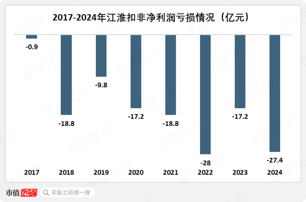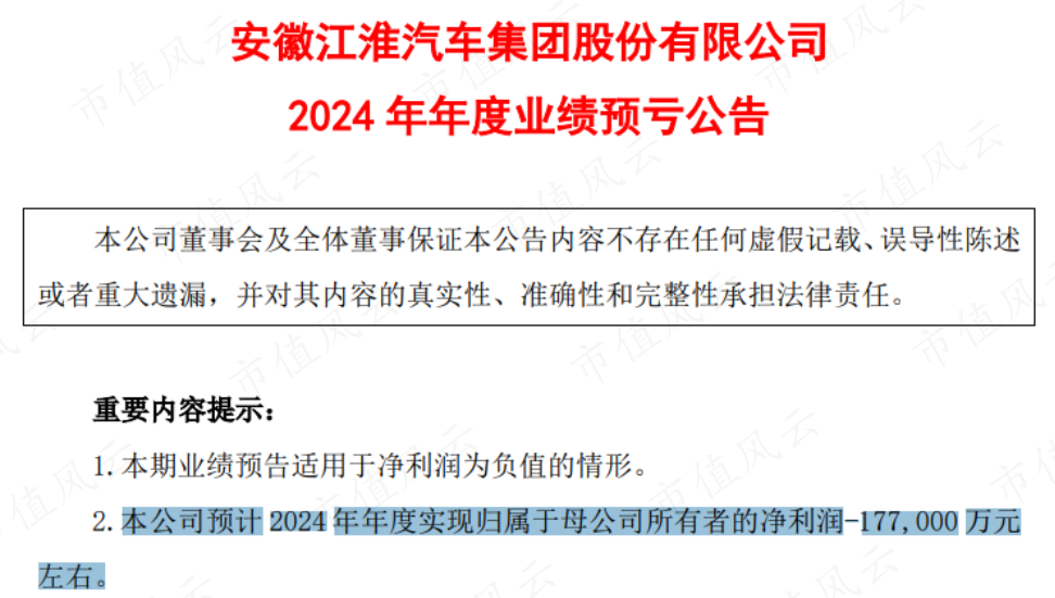 2025年1月25日,江淮发布了2024年业绩预亏公告,全年归母净利润亏损17.7亿元,扣非净利润亏损27.4亿元。