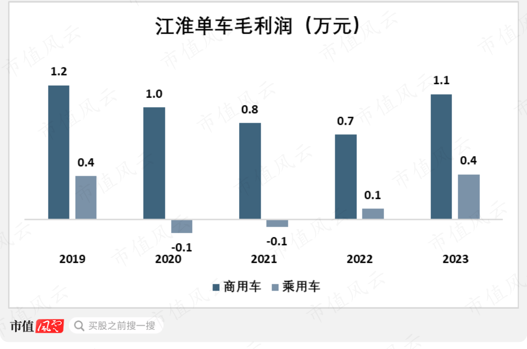从江淮的单车毛利润,我们能看到其连年亏损的根源之一。近几年,江淮的乘用车毛利润一直不高,2020、2021两年甚至是负值,可以说商用车撑起了江淮盈利的大头。不过,即使是在情况较好的2023年,江淮的整体毛利率也只有11%。