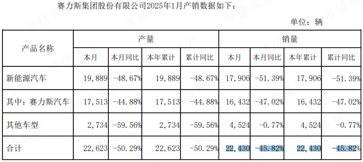 2025年1月份的产销数据显示,赛力斯的当月产销环比与同比下滑幅度均在40%以上。考虑到春节因素以及理想等友商保持同比增长的情况,不难推测赛力斯的销量下滑很大程度来自于华为资源的分流。