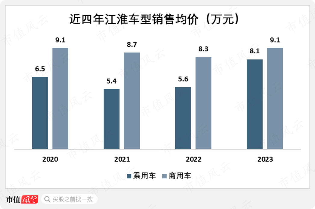 2024年以前,江淮的乘用车和商用车的销售均价从未突破10万元大关,从产品售价和车型定位来看,江淮主打的一直都是入门、实用的低端高性价比车型。